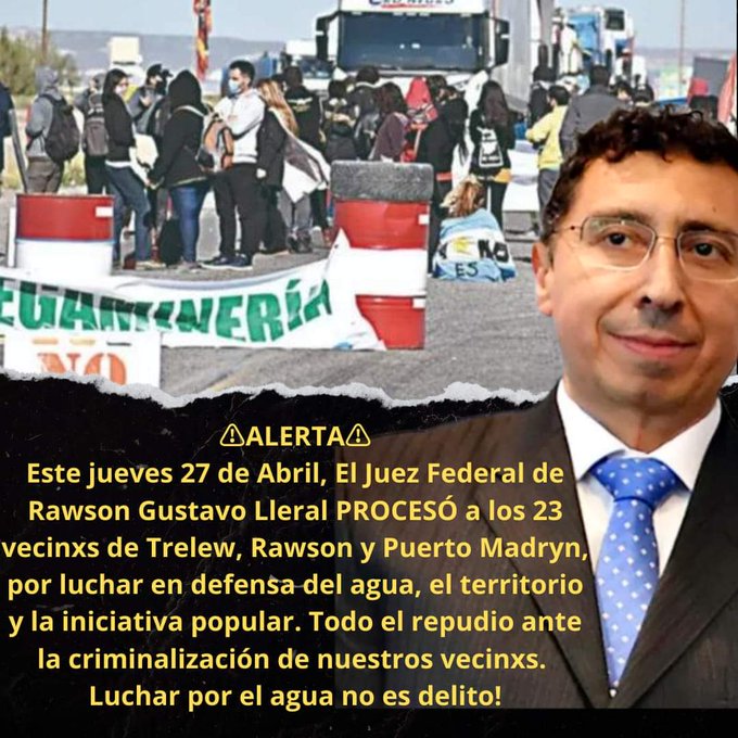 El Juez Federal de Rawson, Gustavo Lleral, dictó este jueves el procesamiento de 23 vecinos de Trelew, Rawson y Puerto Madryn. Estaban imputados por el corte de la Ruta Nacional 3 en la salida norte de Trelew, en mayo de 2021, en defensa del agua, el territorio y la iniciativa popular.