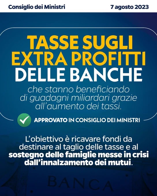 Presidido por la ultraderechista Giorgia Meloni, el Gobierno de Italia aprobó en la noche de este lunes la creación de un impuesto del 40% sobre los beneficios extraordinarios de los bancos, limitado a los años 2022 y 2023.
