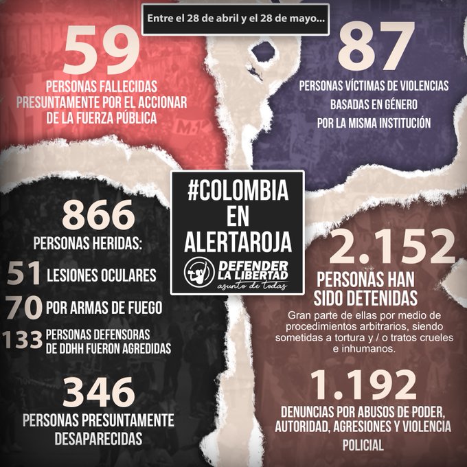 Al cumplirse el primer mes de las protestas y movilizaciones contra el Gobierno de Iván Duque, las organizaciones que hacen parte de la campaña Defender la Libertad denunciaron que la violencia sistemática en el contexto del paro nacional ha dejado un saldo de 59 personas asesinadas.