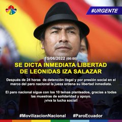 24 horas después de que fuera arrestado el presidente de la Confederación de Nacionalidades Indígenas de Ecuador (Conaie), Leonidas Iza, fue liberado hoy, mientras sigue el paro indefinido y las movilizaciones en demanda de la reducción del alto costo de la gasolina, la fijación del precio mínimo de productos agrícolas y la moratoria de la