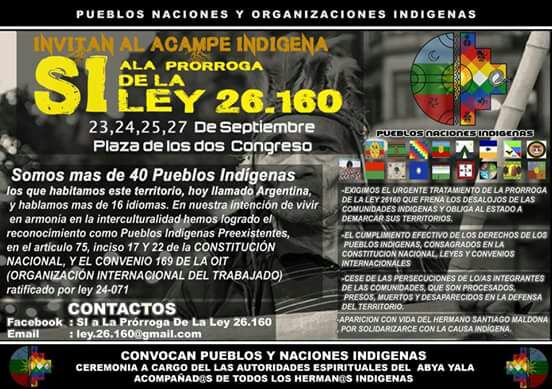 Comunidades de Pueblos Originarios instalarán una carpa frente al Congreso del 23 al 27 de Septiembre para pedir la aprobación de la prórroga a la LEY NACIONAL DE ORDEN PÚBLICO 26.160. La misma prohíbe el desalojo de las tierras. ¡Sumate a la causa Indigena! ¡Acompañalos en esta lucha en Defensa de la Vida! Contactos: (011)