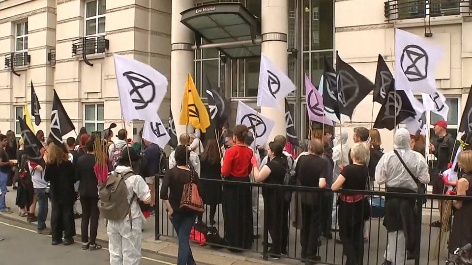 En Londres, activistas contra el cambio climático pertenecientes a la agrupación Rebelión Contra la Extinción se manifestaron el martes durante la celebración de la Semana de Acción Climática de Londres en las sedes de cinco grandes compañías petroleras para exigir el fin de las perforaciones.