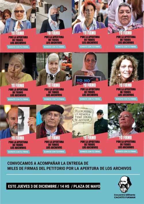 En el marco de la 40º Marcha de la Resistencia de Madres de Plaza de Mayo-Línea Fundadora, organismos de derechos humanos, encabezados por el Encuentro Militante Cachito Fukman, presentarán este jueves 3 de diciembre en Casa de Gobierno un petitorio con más de 8000 firmas con el reclamo histórico por la apertura de los archivos
