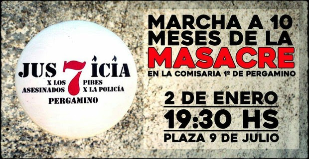 El próximo martes 2 de enero se cumplen 10 meses de la masacre en la Comisaría 1º de Pergamino. Como todos los días 2 se convoca a marchar, a las 19:30, desde la plaza 9 de Julio de esta ciudad para exigir “Justicia x los 7”