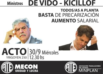 El miércoles 30 de setiembre a las 12.30 los trabajadores y las trabajadores estatales del Ministerio de Economía realizarán una batucada y acto en Irigoyen 250 (CABA) para reclarmar al ministro de Economía Acel Kicillof y al de Planificación, Julio De Vido, el pase a planta y aumento salarial