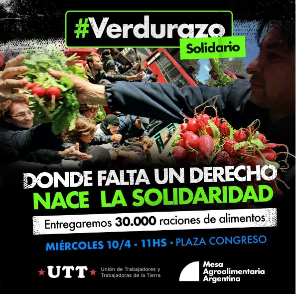 Este miércoles 10 de abril en Plaza Congreso, agricultores familiares y cooperativistas nucleados en la Mesa Agroalimentaria Argentina regalarán 30 mil raciones de alimento a quienes “sufren las medidas económicas y los despidos injustificados del Gobierno”.