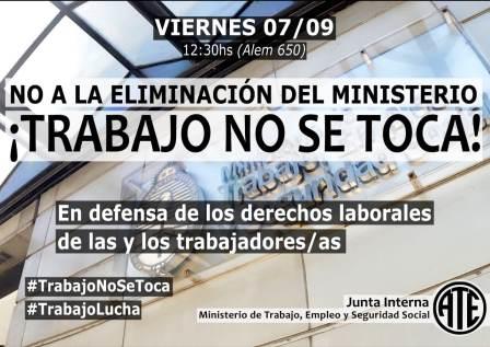 La Junta Interna de ATE convoca a una movilización en rechazo a “la eliminación del Ministerio de Trabajo” mediante su reducción a una Secretaría laboral, ante el peligro que supone para las tareas sociales que lleva a cabo, los derechos de toda la clase trabajadora y la continuidad laboral del personal. La actividad tendrá lugar