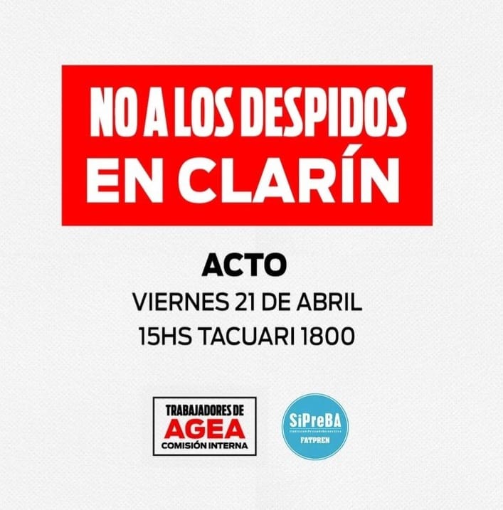 Los y las trabajadores del Diario Clarin realizaran mañana viernes a las 15 hs una asamblea abierta y acto contra los despidos en la puerta del diario, Tacuarí al 1800 en Ciudad de Buenos Aires.
