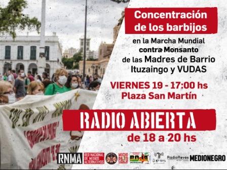 Este viernes 19 de mayo desde las 17.00, en el marco de la Jornada Mundial contra Monsanto-Bayer y de la “Concentracion de los Barbijos”, las Madres de Ituzaingo Anexo y VUDAS (vecinxs unidxs en defensa de un ambiente seguro) realizarán su ronda en la Plaza San Martin, como todos los meses desde hace tres años.