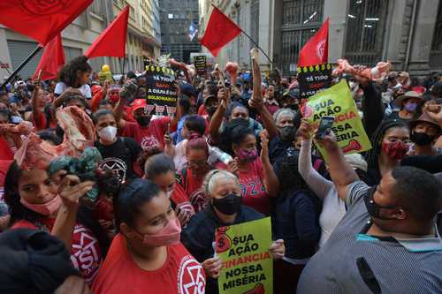 Activistas del Movimiento de Trabajadores Sin Techo (MTST) de Brasil ocuparon brevemente ayer la sede de la Bolsa de Valores de Sao Paulo, la principal de América Latina, para protestar contra la escasez y el hambre.
