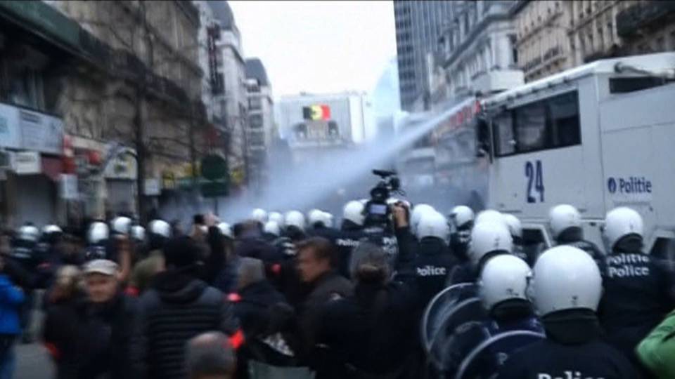 En Bruselas, Bélgica, la policía utilizó cañones lanza agua contra manifestantes de extrema derecha que irrumpieron en un homenaje a las víctimas de los ataques de la semana pasada, con eslóganes nacionalistas y saludos nazis.