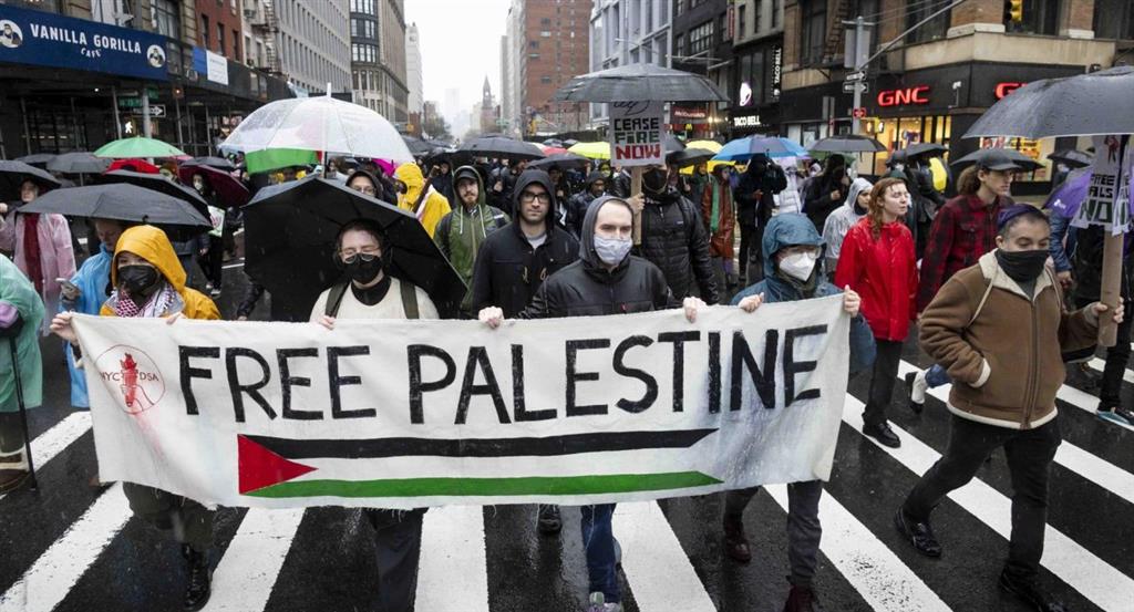 Una masiva movilización de personas salió este sábado bajo la lluvia a las calles de Nueva York, Estados Unidos, en solidaridad con el Día Mundial de Acción en Solidaridad con Palestina.