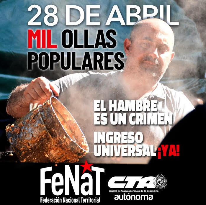 El próximo martes 28 de abril la Federación Nacional Territorial (FeNaT-CTAA) realizará la Jornada MIL OLLAS POPULARES en todo el país para visibilizar la angustiante situación que viven las familias de los barrios populares. Compartimos comunicado Contacto: Omar Giuliani: +54 9 11 37322509