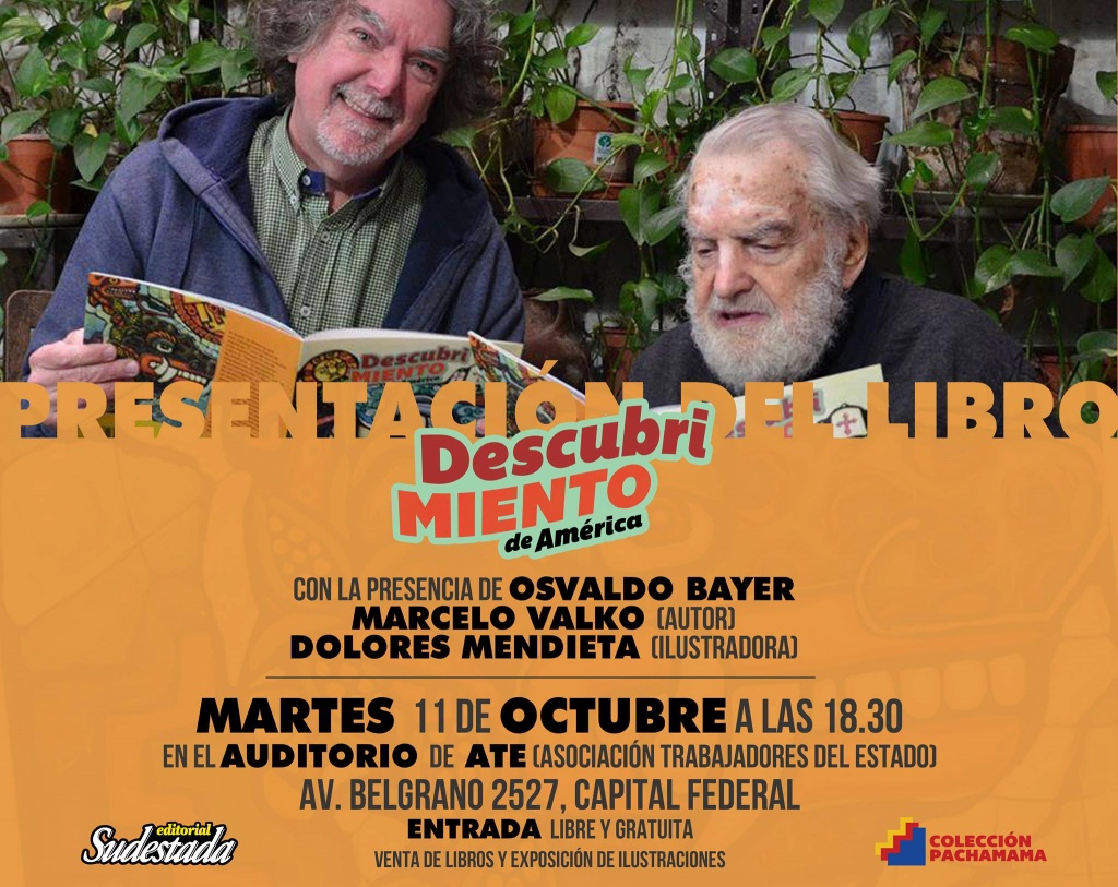 Presentación del libro Descubri MIENTO de América. Con la presencia de Osvaldo Bayer . Este martes 11 de octubre a las 18.30. En el auditorio de ATE (Asociación Trabajadores del Estado). Av. Belgrano 2527, Capital Federal. Colección Pachamama (Sudestada). Marcelo Valko (Autor). Dolores Mendieta (Ilustradora)