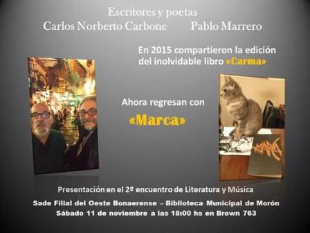 Este sábado 11 de noviembre a las 18 horas se presentará el libro “MARCA” de los escritores y poetas PABLO MARRERO y CARLOS CARBONE. Será en el marco del Segundo Encuentro de Literatura y Música organizado por la Sociedad Argentina de Escritores -Filial del Oeste Bonaerense. Los esperamos en la Biblioteca Municipal de Morón, Brown