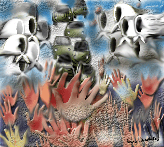 Con el agua hasta el cuello y más arriba con la muerte en el pecho y más abajo la rabia estrujada entre las tripas viendo flotar el pasado viendo el presente ahogado en la foto sepia el guardapolvo blanco el primer beso los abuelos y los viejos junto a un Neruda, un