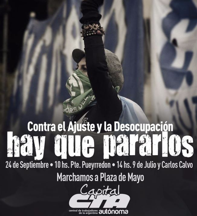En el marco del paro nacional de 36 hs contra el ajuste macrista, desde la CTA Autónoma de la Capital Federal realizaremos, junto a organizaciones sociales, un corte en el Puente Pueyrredon el día lunes 24 de septiembre a las 10hs, para luego marchar a las 14 hs. desde Carlos Calvo y 9 de Julio