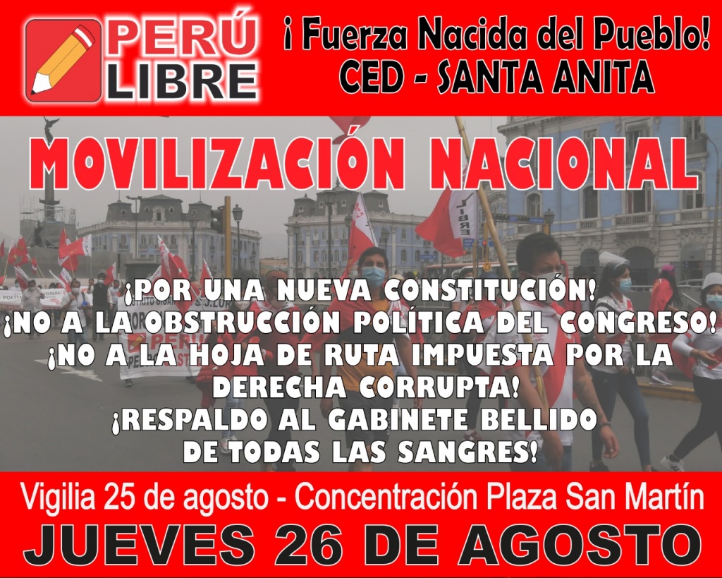 El secretario general el partido Perú Libre, Vladimir Cerrón, convocó el lunes a una marcha contra lo que llama el sabotaje en curso para desarticular el gabinete propuesto por el presidente Pedro Castillo, encabezado por Guido Bellido como primer ministro.