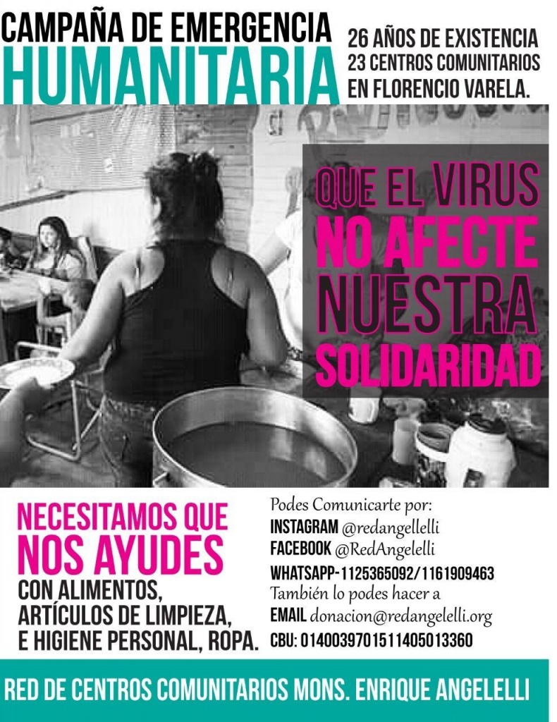 Se trata de la Red de Centros Comunitarios Mons. Enrique Angelelli quienes ofrecerán viandas a las familias de sus comunidades. Necesitan para poder armarlas, alimentos en general y mercaderías frescas en particular. Compartimos el comunicado