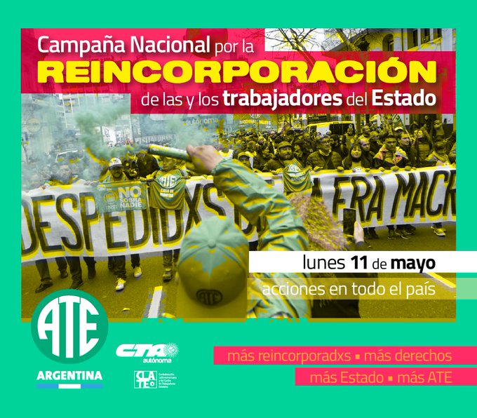 Este lunes 11 de mayo, la Asociación de Trabajadores del Estado realizará acciones para exigir la reincorporación de lxs trabajadores despedidxs durante el gobierno de Mauricio Macri.
