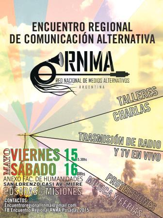 El Encuentro Regional de Comunicación Alternativa, que organiza la Red Nacional de Medios Alternativos, se realizará el viernes 15 y el sábado 16 de mayo en el Anexo de la Faculta de Humanidades, ubicada en San Lorenzo casi Avenida Mitre de Posadas, Misiones. Habrá charlas, talleres, transmisión de radio y tv, ferias, proyecciones y música.