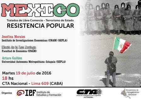 Este martes 19 de Julio a las 18.00, en el 1er piso de la CTA A (Lima 609) se realizará una charla debate sobre “México – Tratados de Libre Comercio, Terrorismo de Estado y Resistencia Popular”, en el marco de los Encuentros de Pensamiento Crítico organizados por el Intituto de Estudios y Formación (IEF)