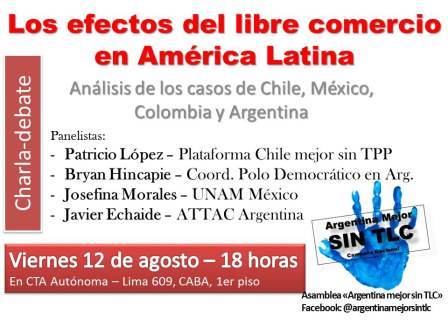 Este viernes 12 de agosto a las 18.00: “Los efectos del libre comercio en América Latina. Análisis de casos de Chile, México, Colombia y Argentina”. Panelistas: Patricio López (Plataforma Chile mejor sin TPP), Bryan Hincapie (coordinador Polo Democrático en Argentina), Josefina Morales (UNAM México), Javier Echaide (ATTAC Argentina). Invita: Asamblea Argentina Mejor sin TLC. En