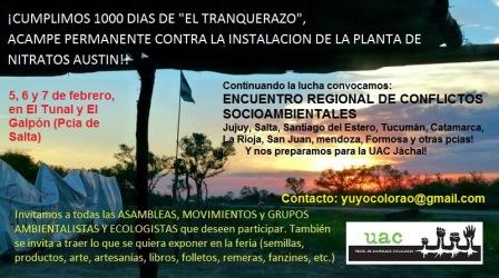 Los días 5, 6 y 7 de febrero se realizará el Encuentro Regional de Conflictos Socioambientales, en El Tunal y El Galpón, provincia de Salta. Este evento se desarrollará en el marco de la lucha de los 1000 días del acampe permanente “El Tranquerazo”, contra la instalación de la planta de Nitratos Austin. Copartimos el