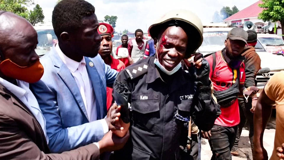 En Uganda, el candidato presidencial Bobi Wine suspendió su campaña después de que miembros de su equipo resultaron heridos y dispararon contra su automóvil.