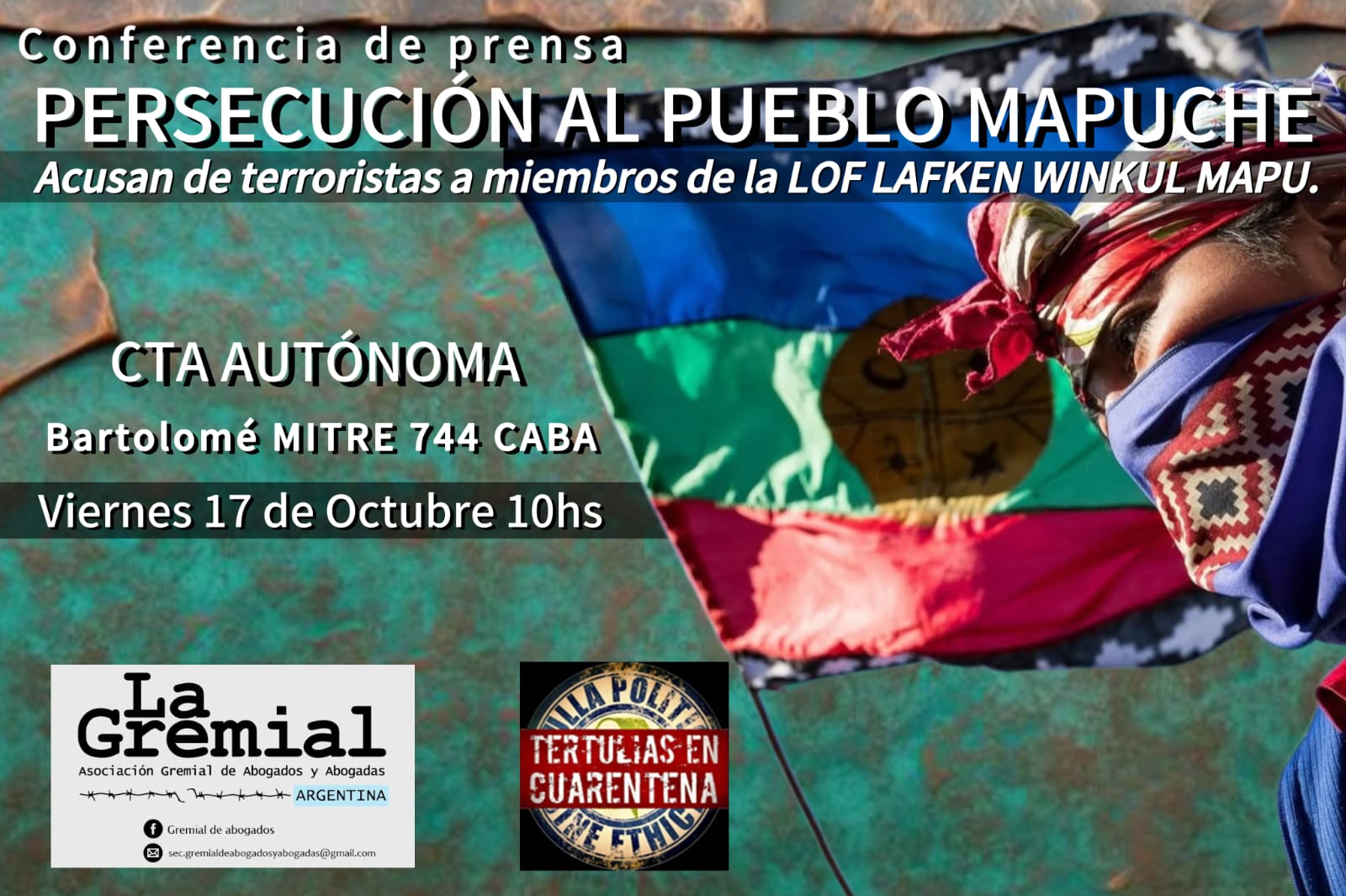 Este viernes 17 de octubre, a las 10, se realizará una conferencia de prensa en la sede de la CTA-Autónoma, ubicada en Bartolomé Mitre 744 de la Ciudad de Buenos Aires, para denunciar que distintos miembros de la Comunidad Lafken Winkul Mapu y otras personas mapuche que fueron criminalizadas han sido incluidos en el Registro…