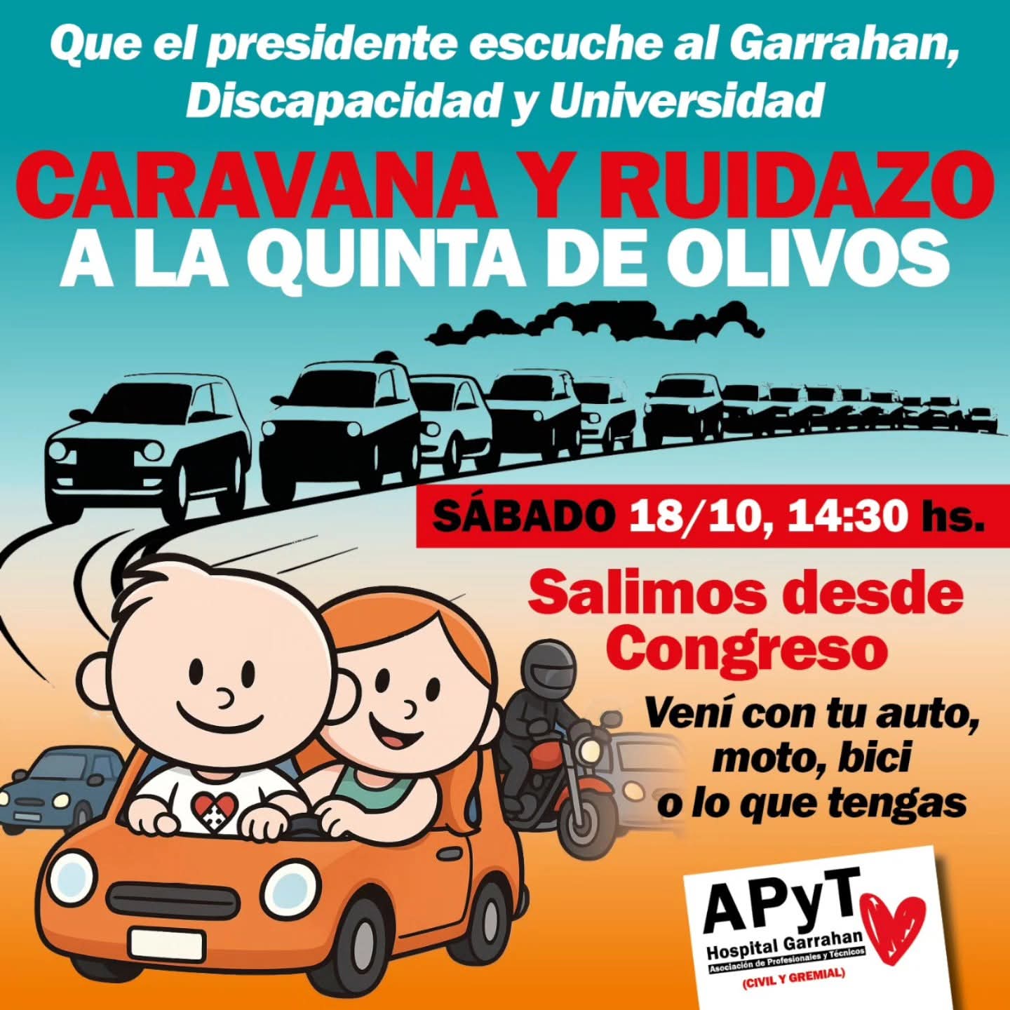 La Asociación de Profesionales y Técnicos del Hospital Garrahan (APyT) convocó para este sábado 18 de octubre a una “caravana y ruidazo” que partirá a las 14.30 desde el Congreso para dirigirse a la Quinta Presidencial de Olivos, bajo la consigna “Que el presidente escuche al Garrahan, Discapacidad y Universidad”.El objetivo de esta medida es…